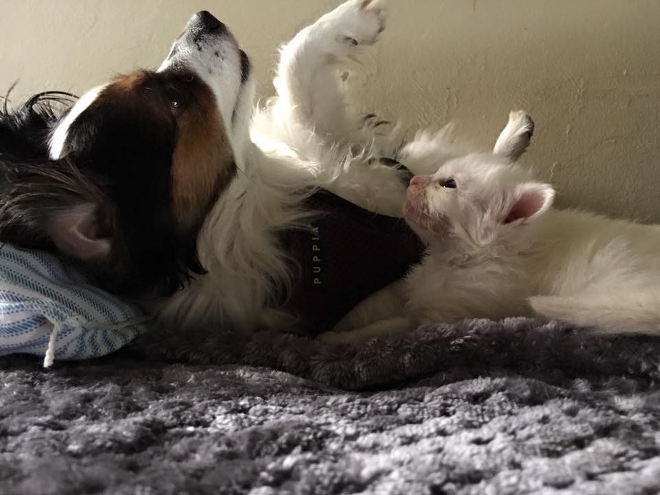 Bitsy, Sorbara’s dog and a huge cat lover, has taken to the little kittens and is volunteering to be their foster mom.