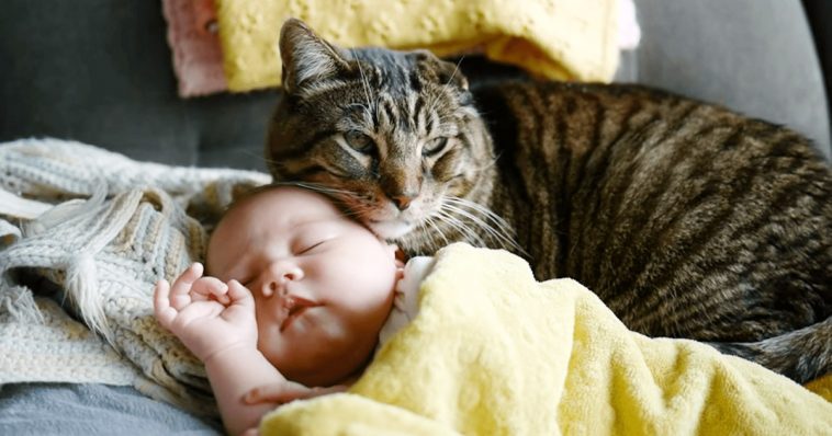 Klaus’ humans commented, “Klaus, an older cat who was once a stray, guards the newest addition to the family – a month-old baby girl named Fern. Look at how gentle he is!”
