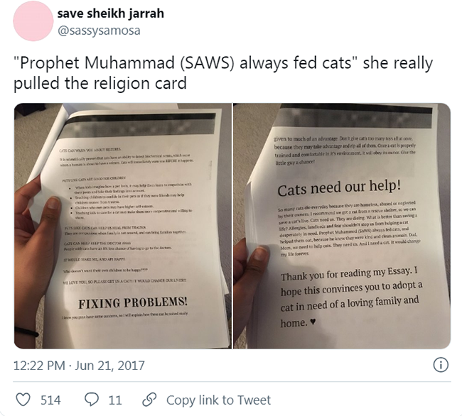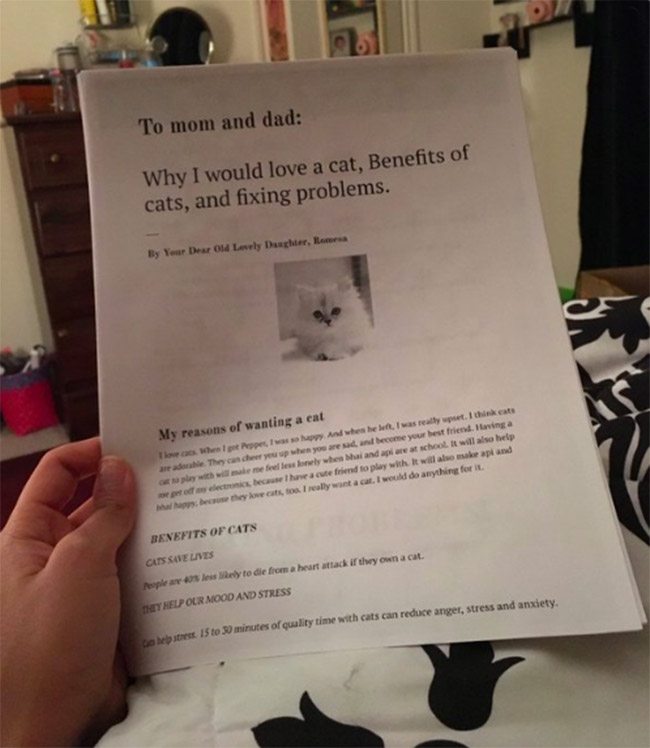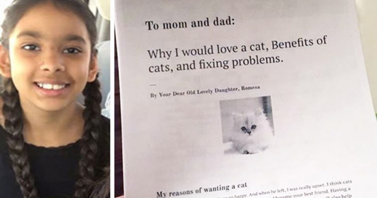 The reasons to adopt a cat are endless. But, 11 year old Romesa from San Antonio, Texas decided to list each and every reason in a six page research report. She prepared it for parents, to convince them to get her a cat. Romesa’s older sister, Rimsha tweeted about the project on June 20, and the viral journey began….