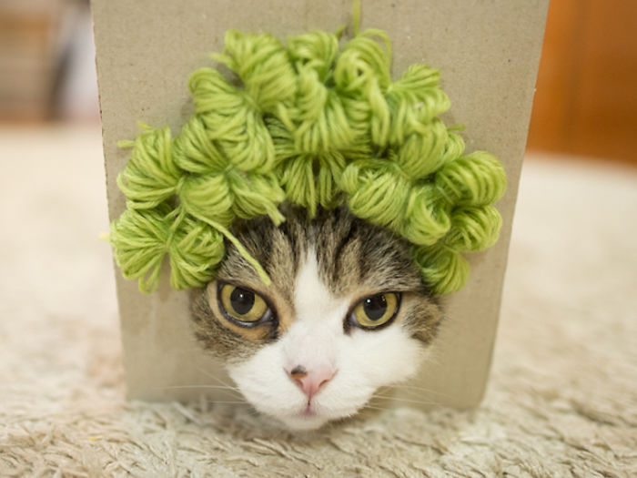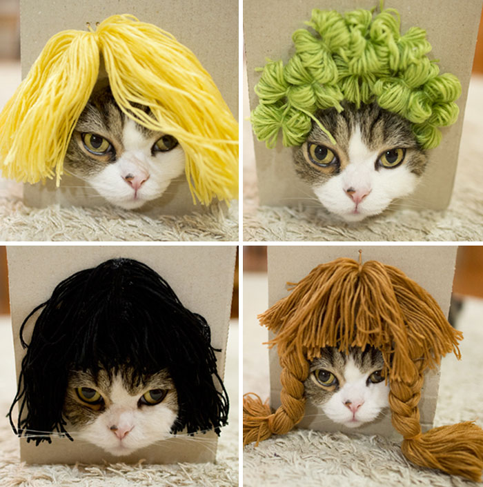 This video features Maru getting tricked into trying on a bunch of wigs! Just above that hole is a variety of different wigs and the cat tried them all on. He rocked everything from green shaggy hair to black bobbed hair to brown pigtails and he managed to pull them all off! Have a look for yourself.