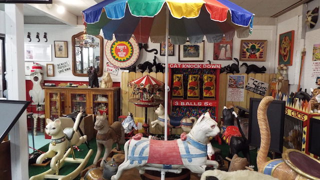 What can you expect to see at the American Museum of the House Cat? You’ll see one-of-a-kind items that include antique cat toys, rare hand-carved carousel cats, and a Medieval petrified cat that was uncovered in a chimney in England. There’s also a display of paintings that include pieces by Andy Warhol, and a bronze cat goddess statue dating back to 600 B.C..