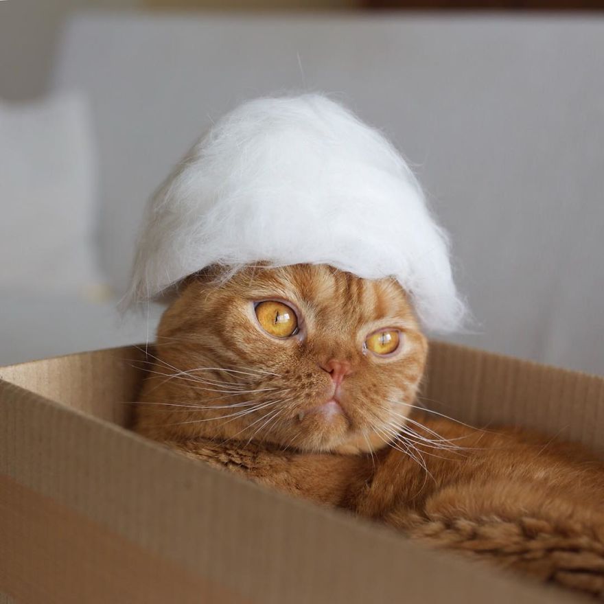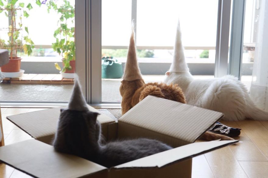 These cats are in hats, and they’re not just any old off-the-rack hats either. These fashionable headpieces have been made with using fur they’d grown and shed. Given that the cats all have different colored coats, the fur balls for making the hats come in three colours: the wheat-coloured variety comes from the youngest kitty, named Mugi, whose name translates to “wheat”, while Nya provides the grey colour, and Maru is responsible for pure white.