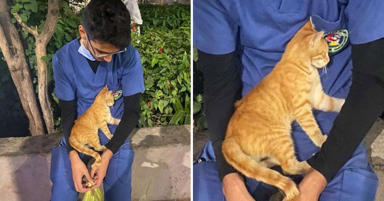Flaty was sitting outside the hospital with his colleagues when a cute stray cat shows up to him, climbed onto his lap, curled up, and fell asleep.