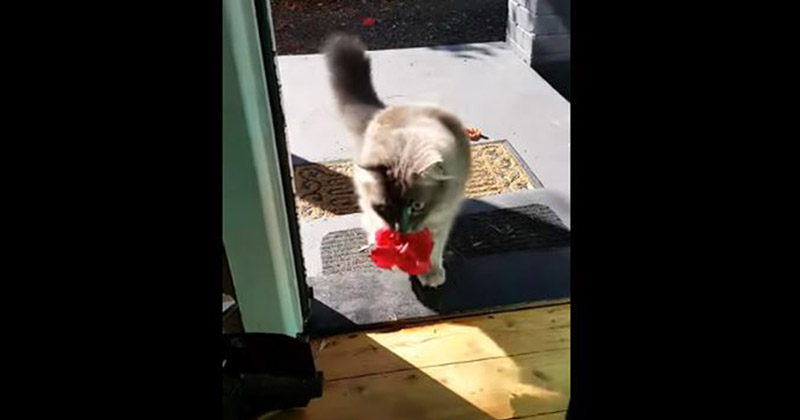 Most cats bring in dead creatures and give them to their owners as a present. This cat however has decided on a completely different type of gift to show her love for her human. A flower!