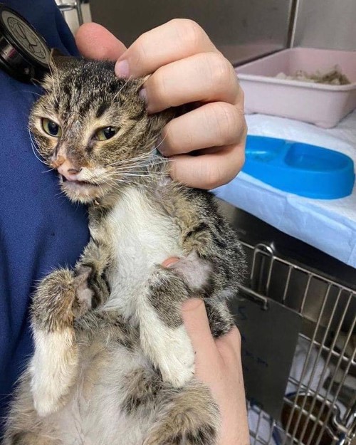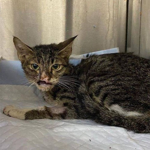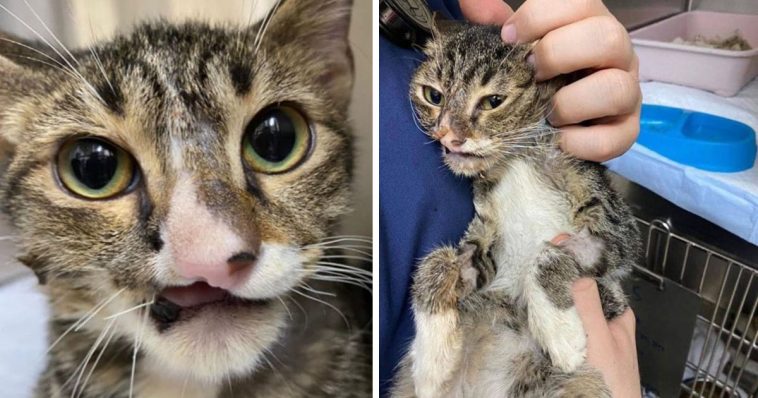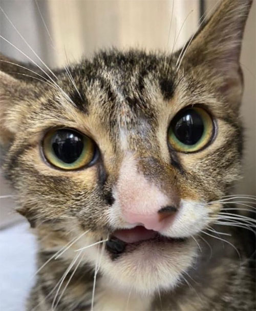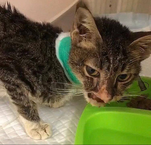 A veterinary examination revealed the kitten was approximately four months old, and his mouth and jaw were severely injured and badly infected. While the vet was unable to determine the exact cause of the young feline’s injuries, they suspected he may have bitten into a power cable.