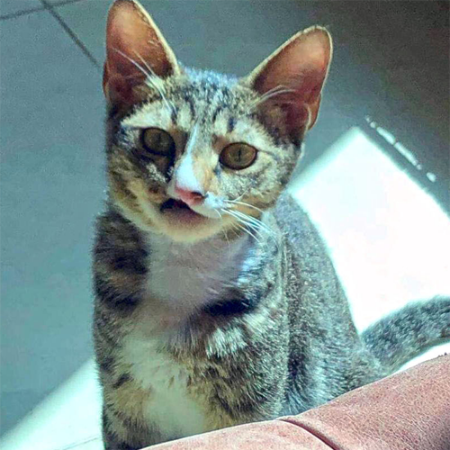 After losing their beloved 15-year-old Burmese cat Horatio, Silke and her husband were looking online for a new feline friend when she came across a Facebook post about an Arabian Mau kitten who had lost all of his teeth and part of his mouth due to injuries he sustained while living on the streets of Dubai. “I saw [his] profile and immediately fell in love with his cute little face,” remembers Silke.