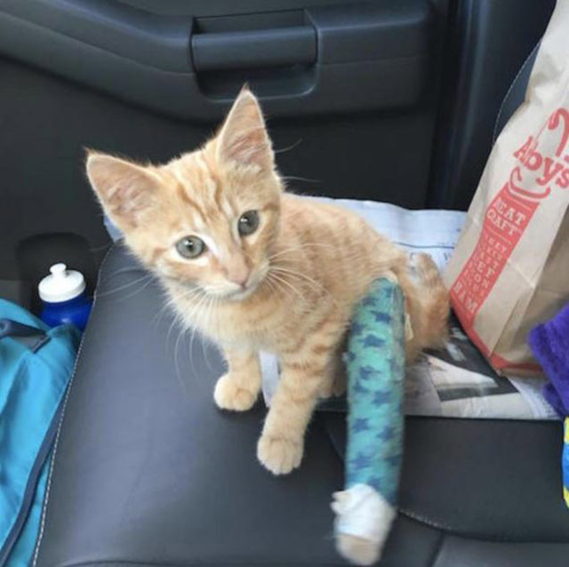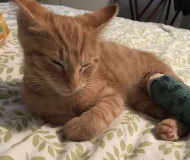 After taking him in and calling him Milo, he was taken to the vets where they discovered he had a broken fibula and tibia.