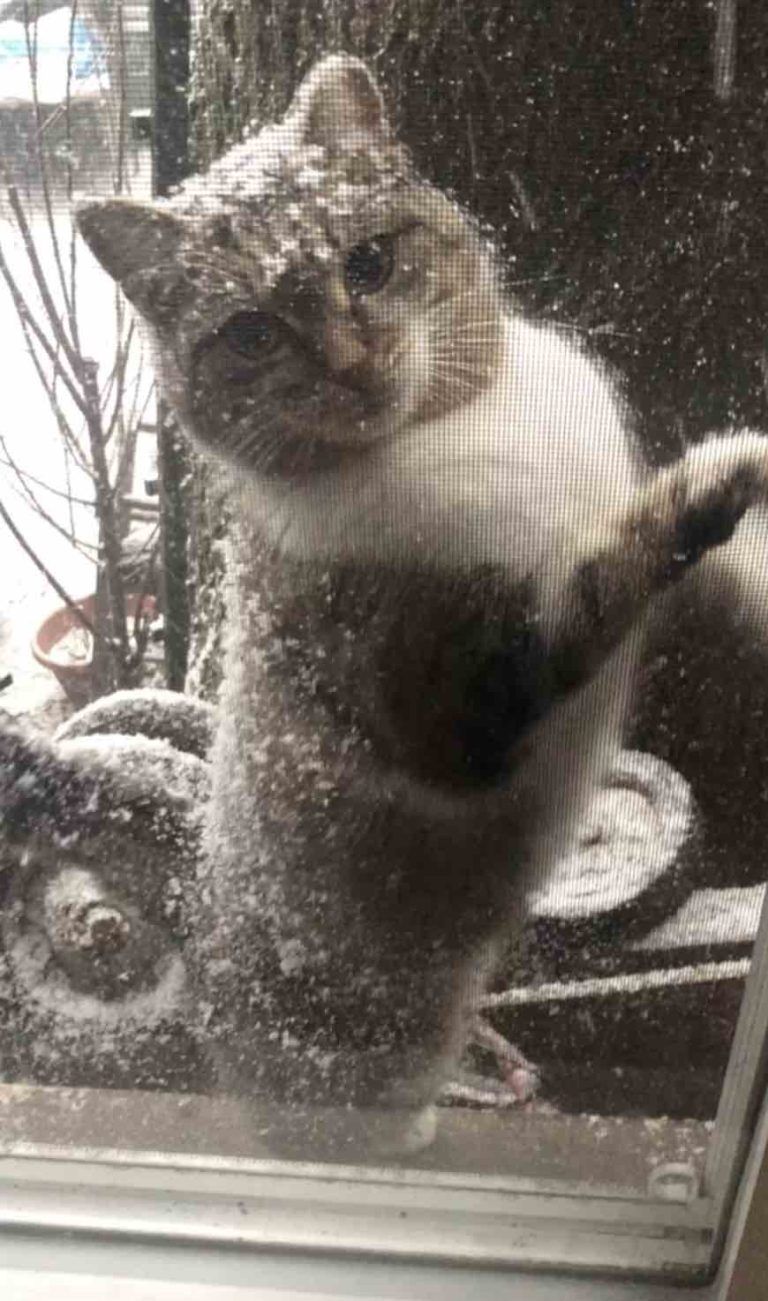 He couldn’t leave this kitty out in the cold and snow so he allowed the shivering cat in so she could warm up on such a miserable day.