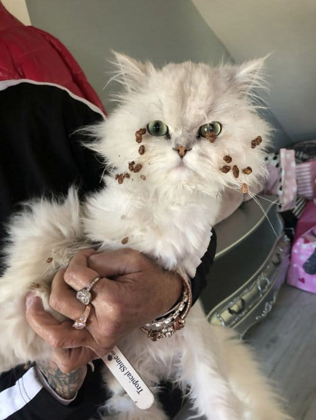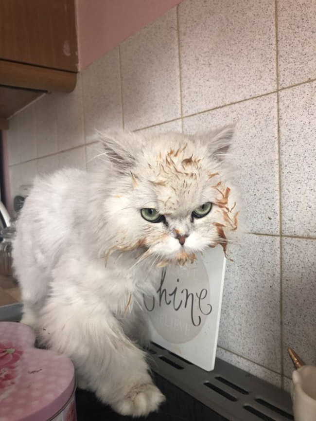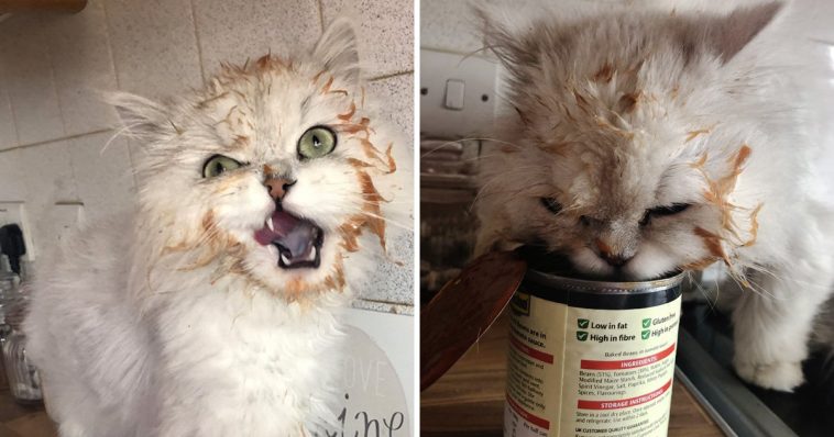 Of course, as soon as Greedy Cat’s thieving adventures were posted online, they became an instant hit. The 18-month old thief became an internet sensation overnight and he doesn’t really seem amused by it. China is a Chinchilla Persian whose pics were liked by nearly 10,000 people on social network sites. Every time Bea posts pics of China’s face covered in baked beans sauce, thousands of people like and comment on them. Bea says that China’s a funny boy who does stupid things, but he never did something like this. He is greedy, though, and tries to get into the cupboard any time he can. It all started when the cat walked nonchalantly past Bea and his mom in the kitchen with bits of food stuck on his long fur.