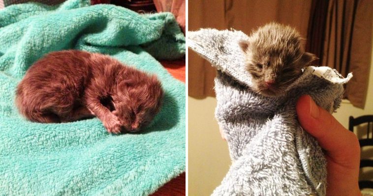 “I found this kitten in the yard all alone,” they said. “The mom left this one when she moved the nest it was left in the open in my yard and I watched a cat come up to it and then walk away, assuming it was the mom.”
