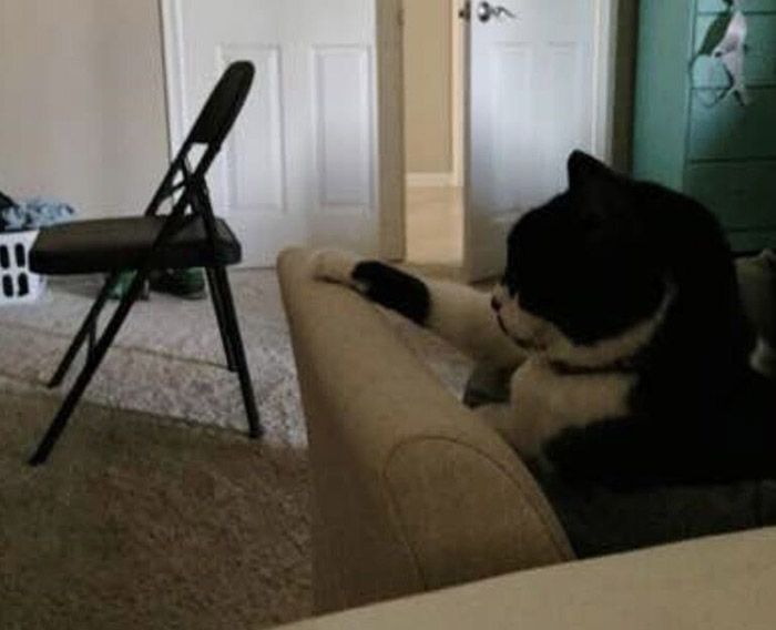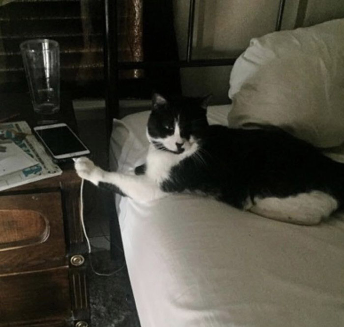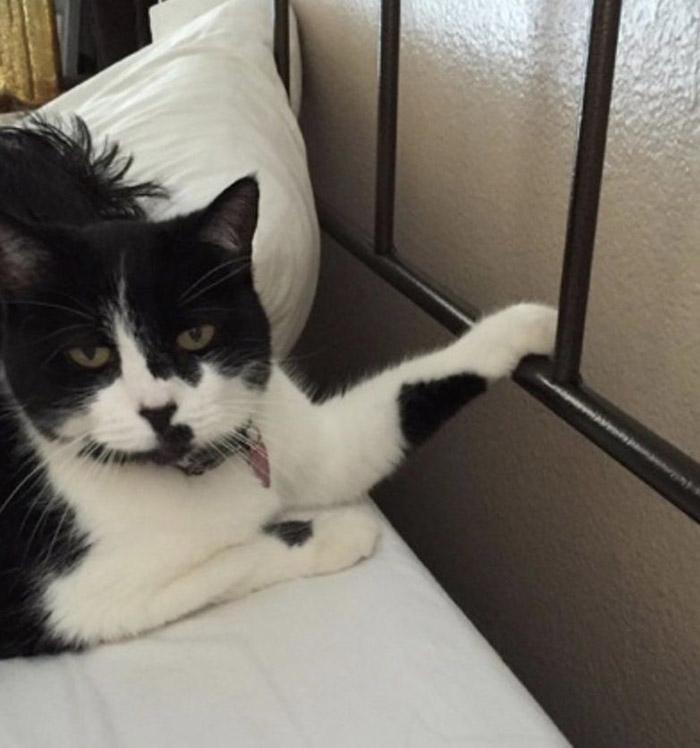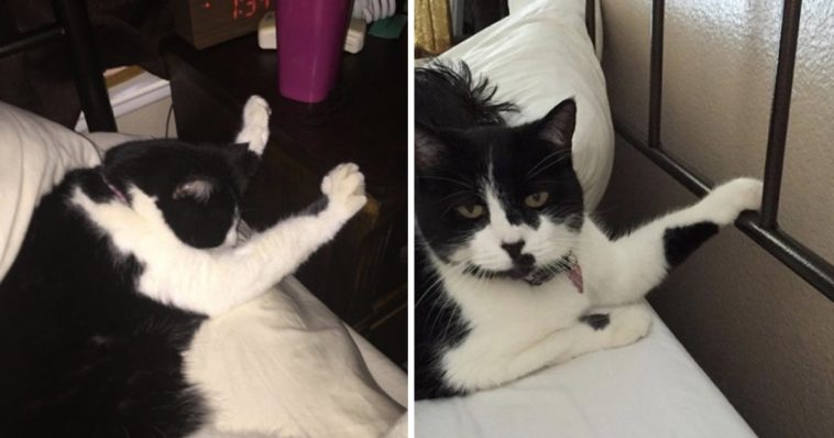 Scroll down to meet an adorable tuxedo cat has a very strange habit. She likes to put her paws on the things close by whenever she is hanging out around the house.