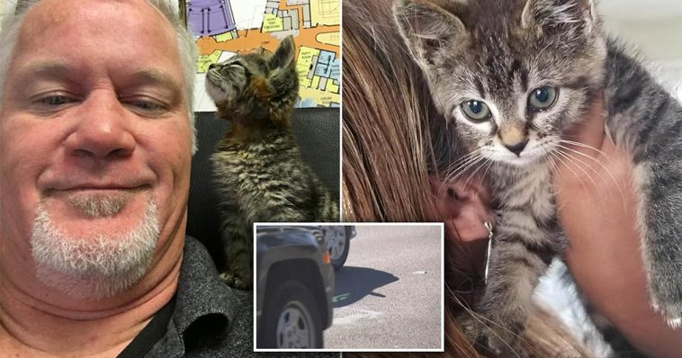 Chuck Halley, a resident of Silverton, Oregon, was walking to work last week when he saw an unusual scene on the road. A scrawny kitten was in the middle of it, with cars racing over it. If it wasn’t for Chuck, the kitten would have died for sure. Chuck rushed to take the kitty back to safety when he noticed that something wasn’t right. Someone glued the kitty’s tiny legs to the road so it couldn’t move an inch!