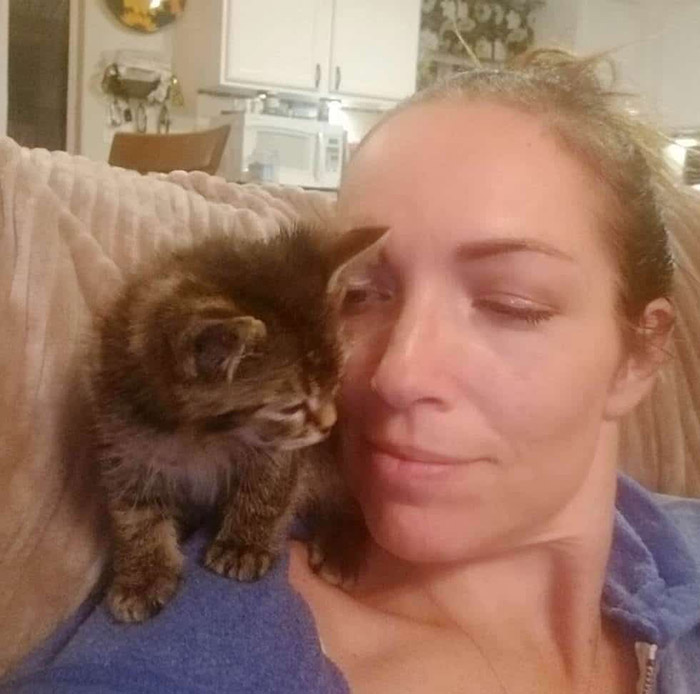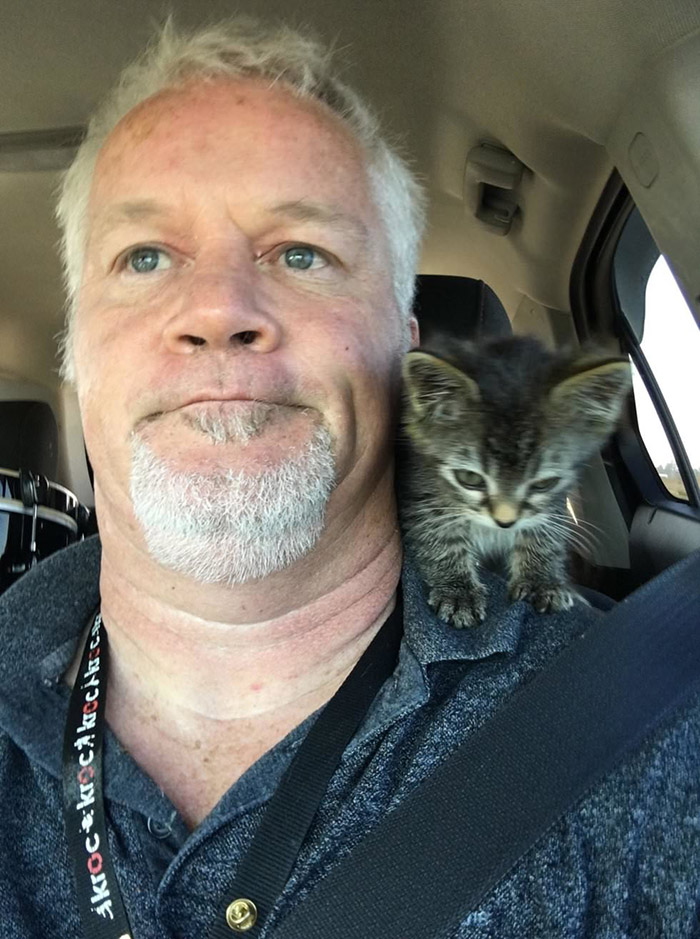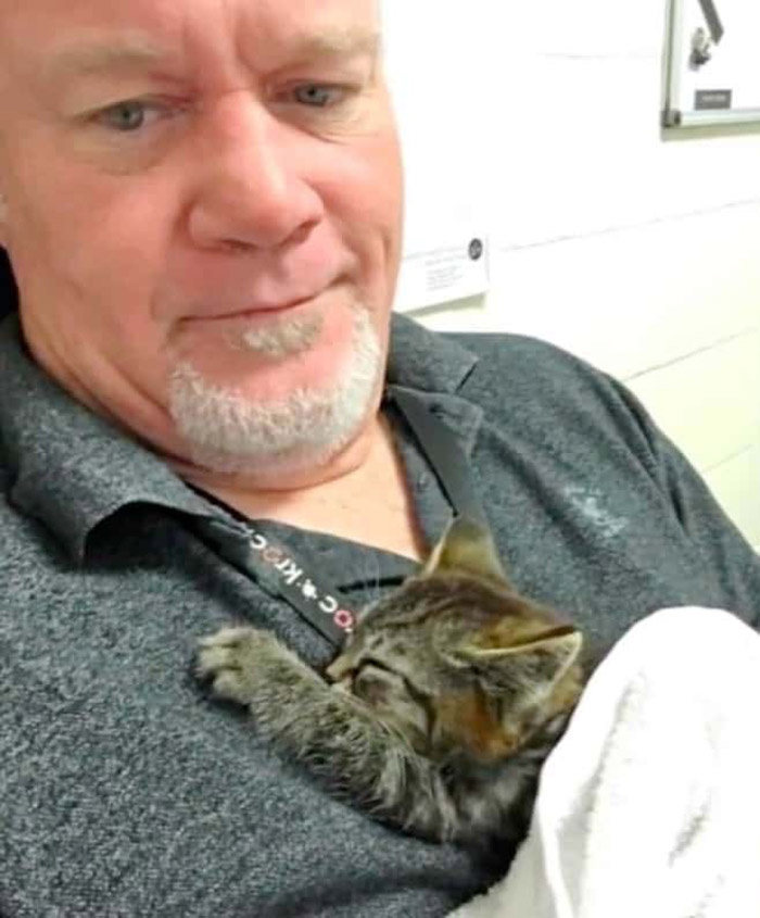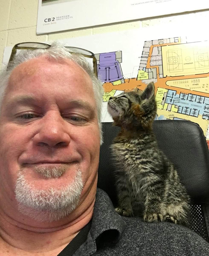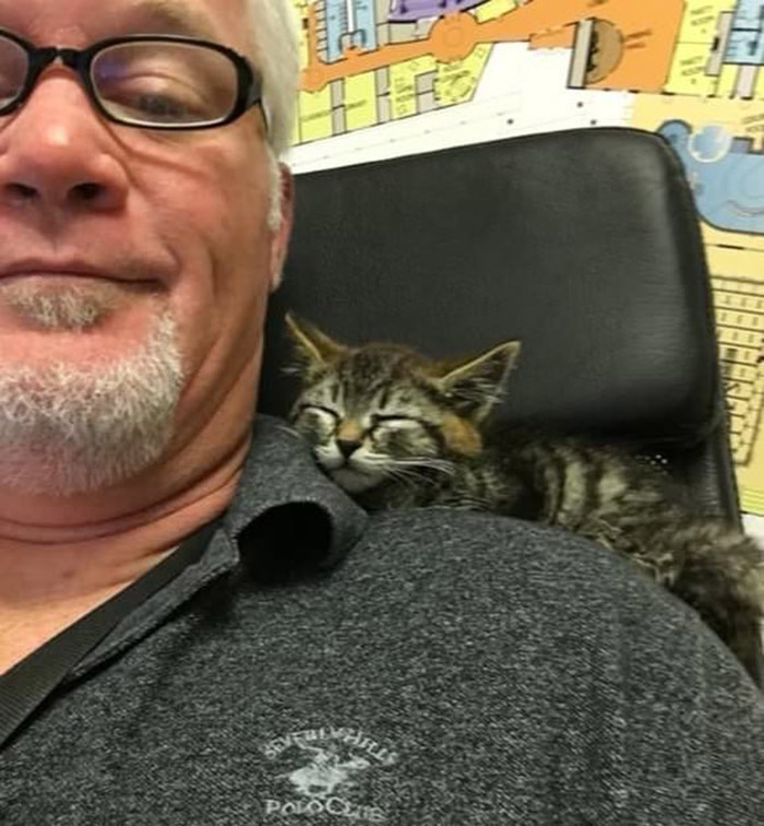 Chuck adopted the kitten and brought it back home with him to the surprise of his wife. They gave her an appropriate name – Sticky. Sticky quickly became Chuck’s favorite pet and doesn’t mind his two dogs.