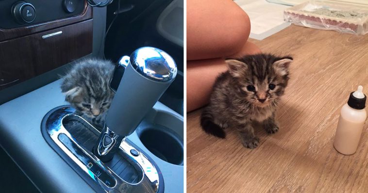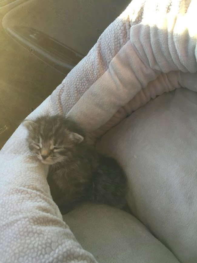 When a young man found this tiny tabby kitten in a box by the trash bin, he picked up the little one and immediately took the kitten to her new home, with him.