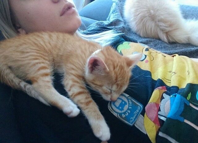 When they finally all arrived home, Kelsey went ahead and placed Atlas in a crate to decompress a bit. She wanted him to realize that now, he was safe and secure in a brand new home. Later on that evening, she was woken up because the kitten began meowing. And so, decided to bring the kitty back toher bed with her. It was there that Atlas fell asleep immediately.