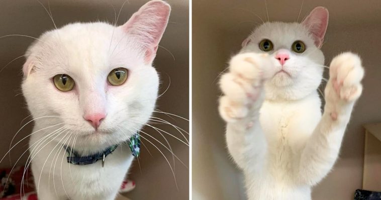 The malformation appeared to be from a previous injury and doesn’t affect Hopper’s quality of life. It doesn’t even bother him – he acts as a regular cat for his age. He’s the sweetest boy at the shelter and his little act booked his ticket for a new home.