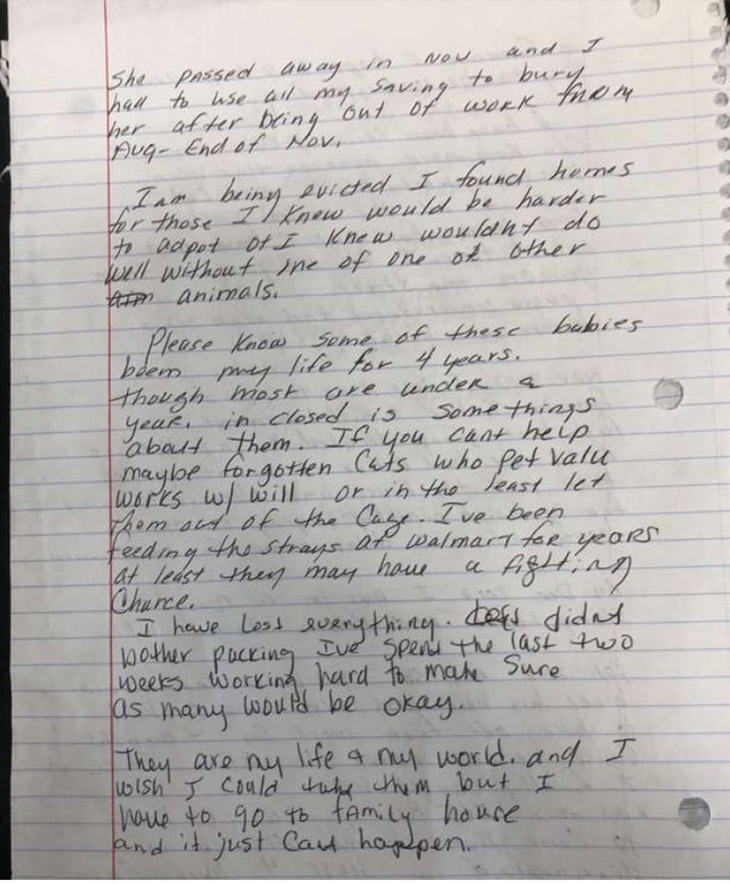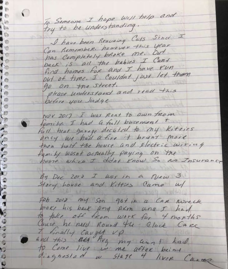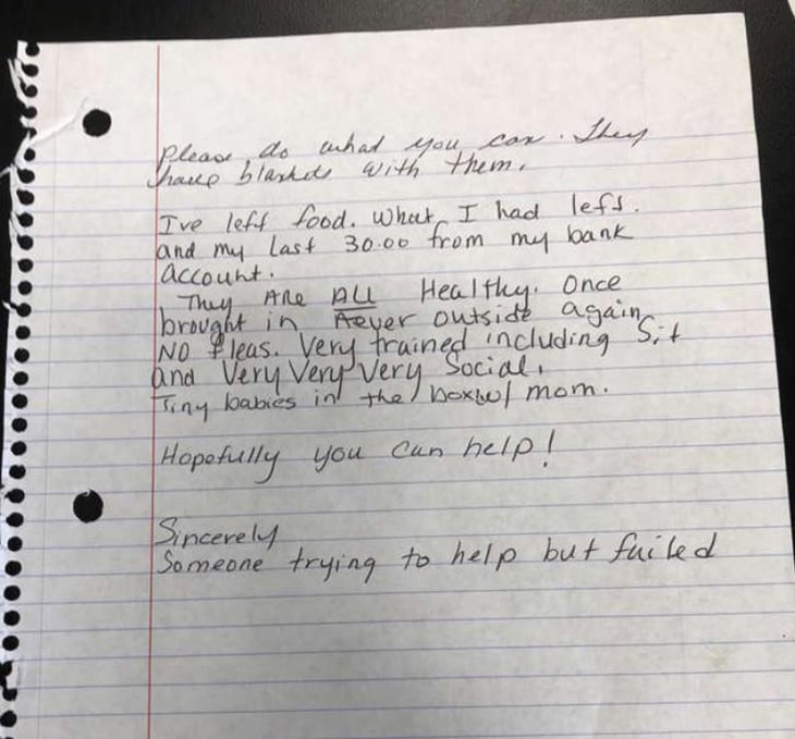 There was a notebook paper that explained why the litter was left outside. It started with: “Understand before you judge”. Of course, the letter explained everything in detail. The owner was suffering from huge family tragedies. His son needed a lot of care after suffering a car accident. His aunt died from cancer. The cat owned spent his savings for the funeral, and just didn’t have the money or energy to care for them anymore.