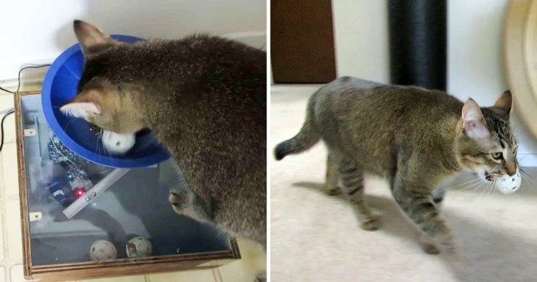 He thought it would be great to train his cat Monkey to look for plastic balls hidden around the house and then throw them into a special designed machine.