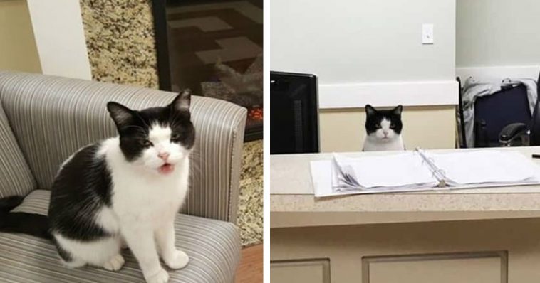 Oreo was living on the streets until she was brought to the St. Augustine Health Ministries in Cleveland. The cat’s unique fur patterns and her love for cuddles made her an instant favorite among the staff. They consider her family and decided to put the kitty on the front desk to greet visitors and help the employees.