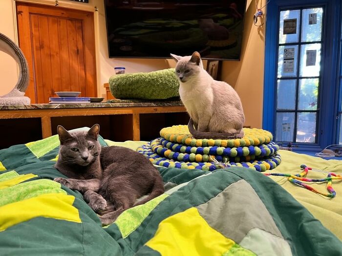 The cats are well taken care of. As if all of it is not enough, they even have their own pillows and blankets