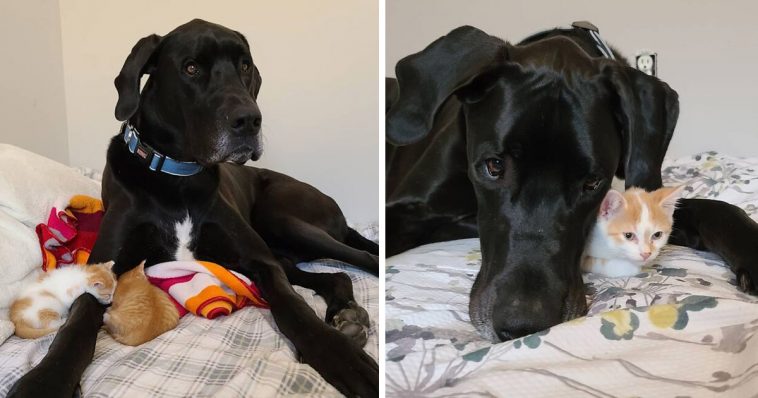 The dog helps to raise kittens that his mom, Karen, has been fostering for a few years now