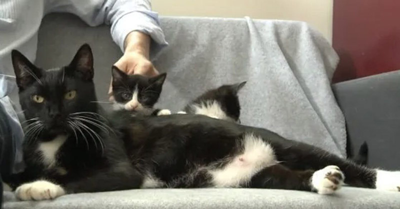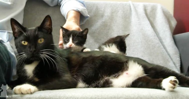 It is unclear how Mickey arrived at the shelter, but three days after she’s been moved to a foster home, she gave birth to five black and white kittens that looked just like their mama.