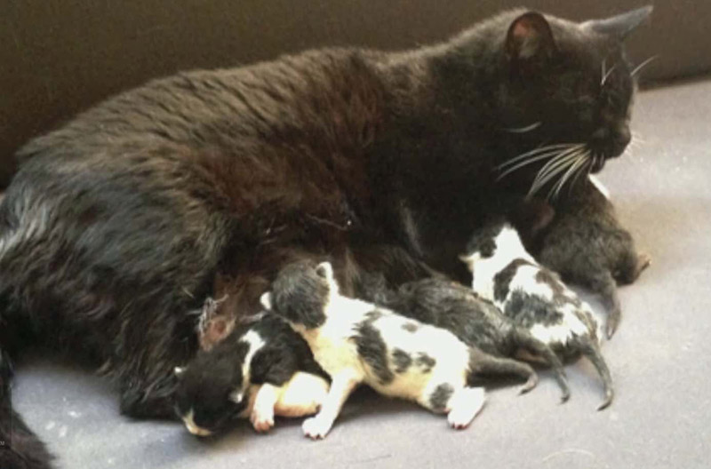 Mama Mickey began licking her new babies, which looked very much like her own babies, and the kittens began feeding.