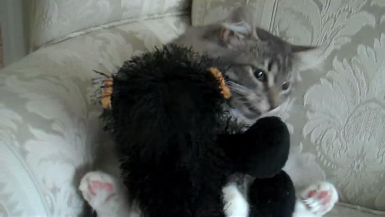 The kitty always try to lick and clean the stuffed toy. She is really enjoying its company.
