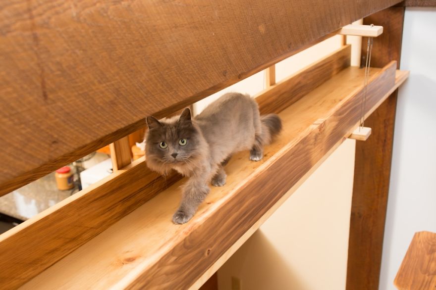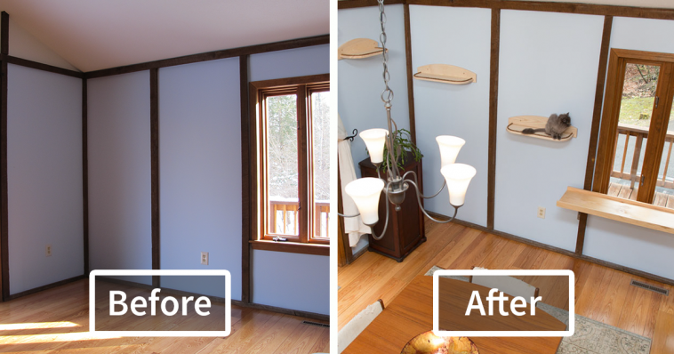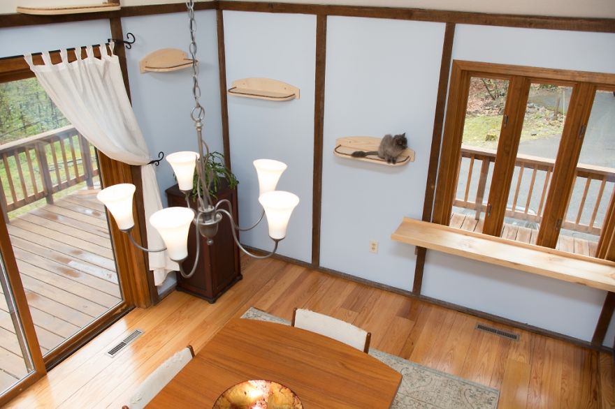 “In February, 2014 my friend Eliza and her partner Tiffany bought their first house together. After seeing a few photos she posted on Facebook, I knew I wanted to help catify their incredible new home for their seven cats. This would be the first time Eliza’s cats Kirby, Agnes, Monkey, Judd and Naked would meet Tiffany’s cats Encore and Pluto and having perches, walkways and cat trees would be an important part of an easier transition into their new home. In addition to the cats, three dogs would call this home as well, making it all the more important that the cats have their “cat only” space.
