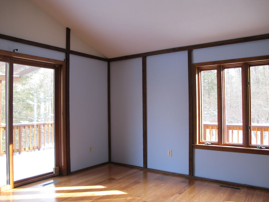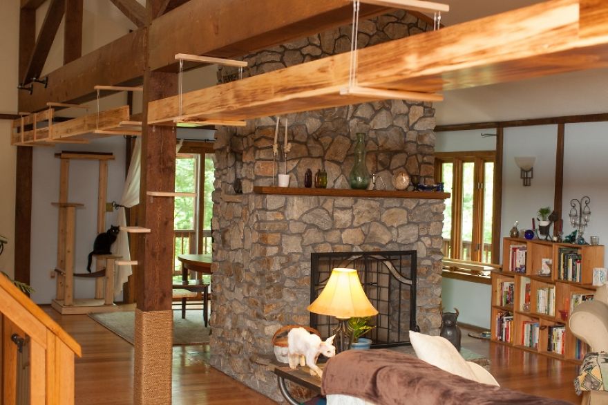 The house was beautiful, not only on its own, but the potential for catification was amazing! Vaulted ceilings and open concept design was ideal for creating vertical spaces for cats. A beautiful stone central fireplace was a major focal point with long beams running the entire length of the house.