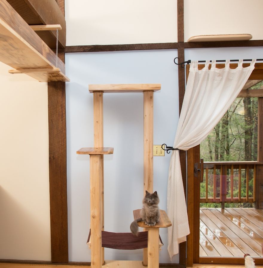 The custom cat tree with hammock provides access to the catwalk and shelves. The cat tree provided a way down to the floor and also access to the first catwalk. Extra-large platforms as well as a roomy hammock made the cat tree perfect for this multi cat home.