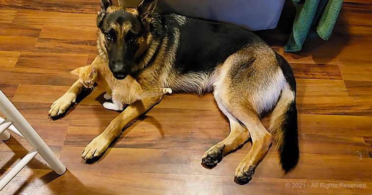 “Our one year old German Shepherd dog, Beck, was very nervous when we first brought home our ginger kitten, Bleu. It took about a week before Beck figured out all Bleu wanted to do was play, and they’ve been best friends ever since. For the last six months they’ve been play fighting, fight fighting, chasing, and cuddling each other every day.”