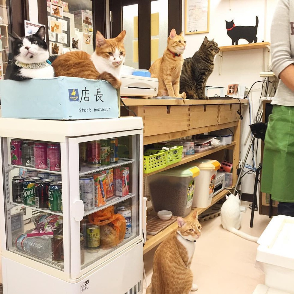 This happy business is run by nine rescue kitties. They even take turn being store manager!