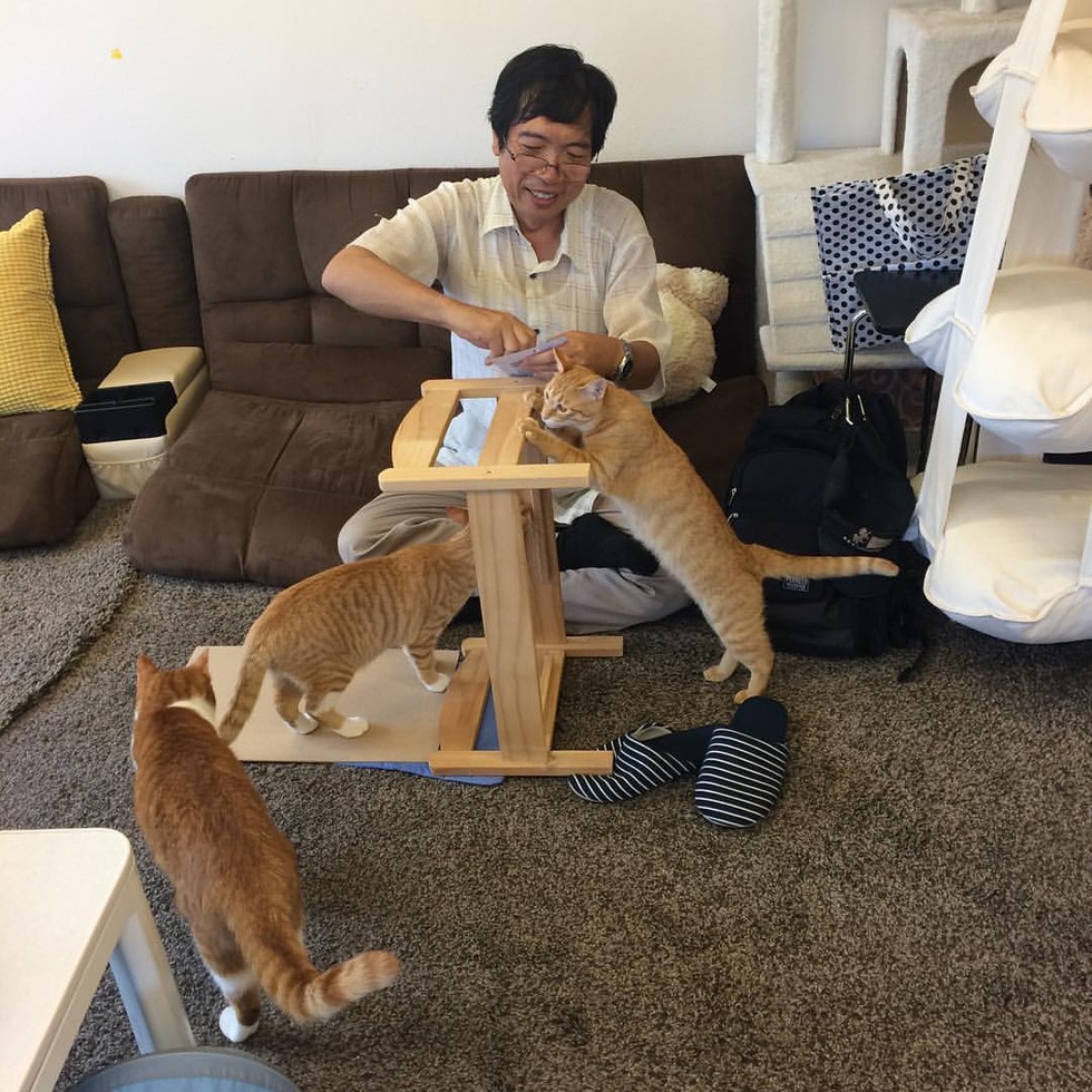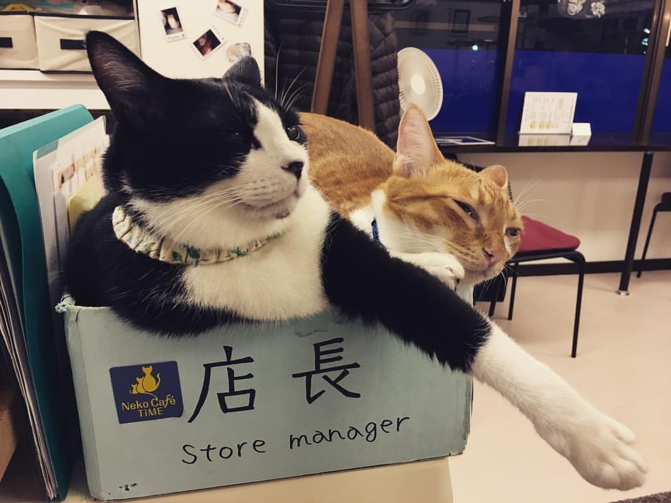 “Bob is the oldest cat in our group, so he became the ‘Store Manager’. He always wears a bowtie and walks around with a serious face. Actually, he is very kind and likes it when people scratch his nose.”