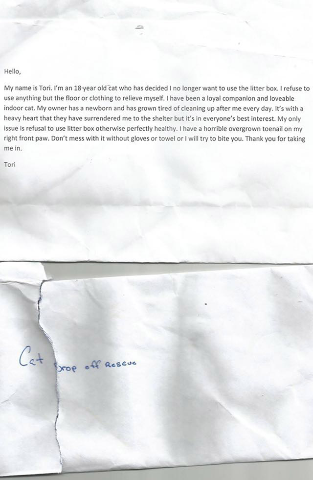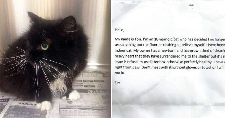 The staff at the Walter M. Crowe Animal Shelter in South Carolina were shocked to find that the 18-year-old cat Tori was waiting in a crate by the door and that a note had been attached to the crate. Her previous owners were not able to keep her so surrendered her at the shelter during after hours.