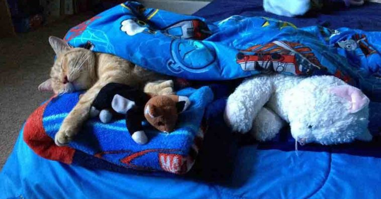 “It’s been almost a year since we took in the neighborhood stray and my son still insists on tucking him in when he naps “so he knows that he lives at our house and will come back.” sympson2612 stated in a post.