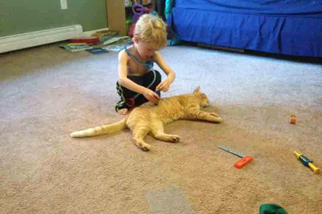 It almost like the boy was so inspired that he started practicing to be a veterinarian..