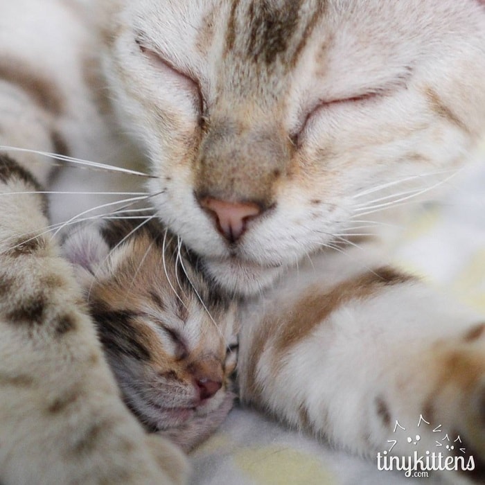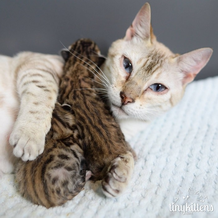 CANADA – This beautiful Snow Bengal cat had so many kittens taken away from her just before she was rescued. When she had her last two miracle kittens, she held them in her arms and wouldn’t let them go.