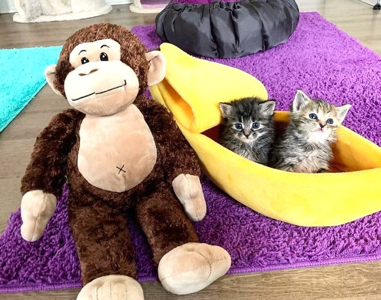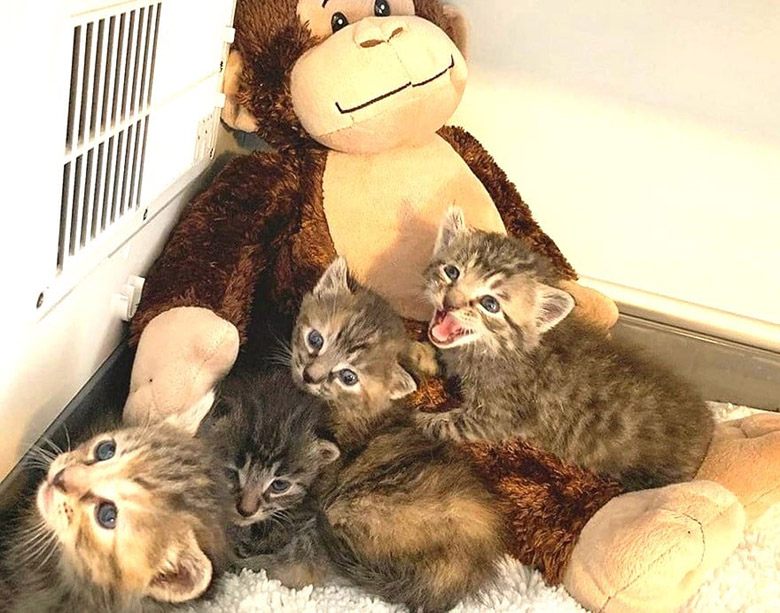 Howie, Vee, and Mac were very playful kittens. They spent their days running around the centre and playing with each other. They also loved to hang around and cuddle with their new toy, a giant plush monkey.