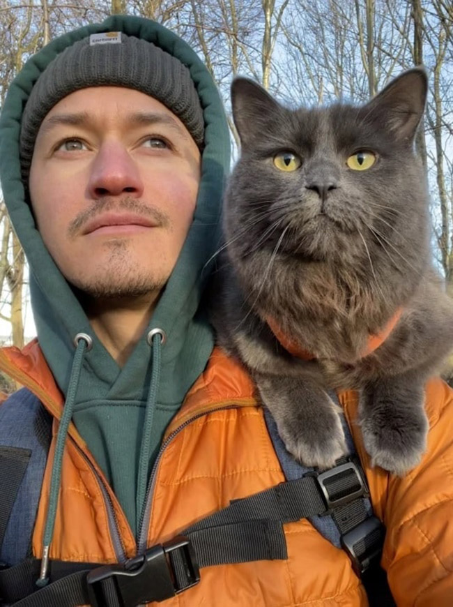 They’re easy to spot as the cat often likes sitting on his owner’s shoulders. It’s proof that cats can be just as affectionate as dogs, and will hopefully inspire others to take their cats on adventures as well.