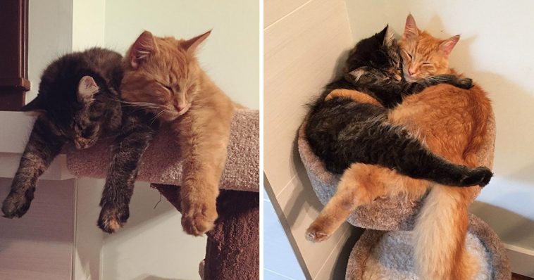 Say hello to Lili (grey) and Renley (ginger) – two adorable kittens that can’t help but snuggle together in their favorite spot – a bed perched on top of a cat condo. Ever since they were adopted, this bed has been their favorite napping spot. Now that they’ve gotten bigger, they’ve obviously outgrown their beloved cuddle bed, but that doesn’t mean the cuddles stop! They will still squeeze in and cuddle. “Renley is usually the boss, so when he wants to cuddle – they cuddle. When he was little he used to meow and look for Lili if she wasn’t in the same room,”