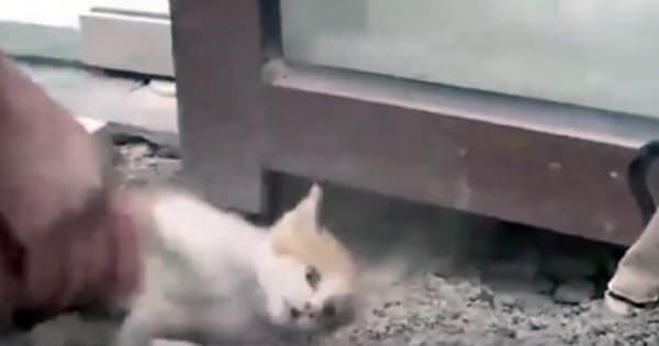 The poor wee one was slowly dying until it spotted a man and meowed desperately. The man’s name is Dong, and he quickly hurried to get help. Dong ended up contacting the property managers, who needed to actually break the glass to free the poor feline.