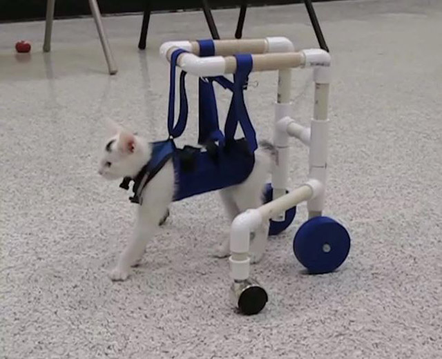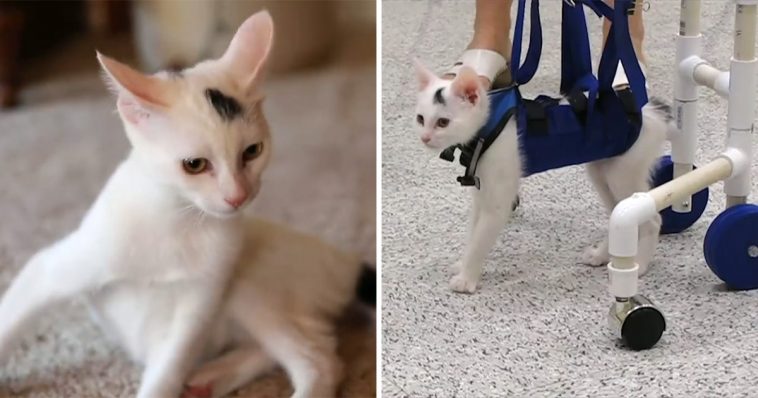 With loads of attention and love from his carers, and with the help of a wheelchair, this joyful, loving kitty learns how to walk.