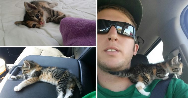 A young man found a tiny, defenseless calico kitten in the middle of a busy street. He grabbed her and put her in his truck. “I found a stray that snores as loud as a train!”