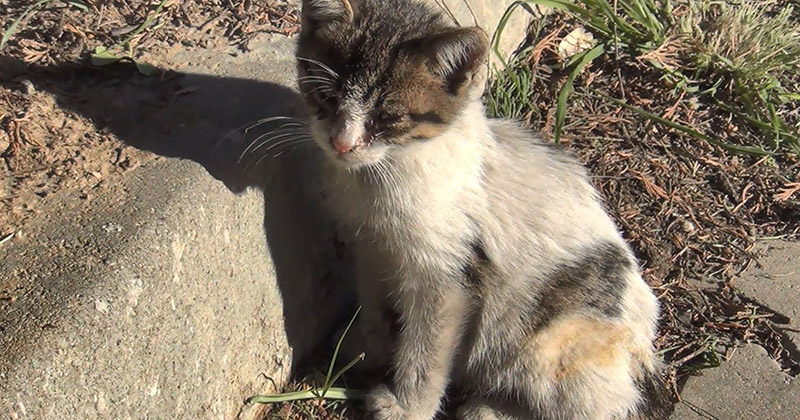 A kind animal lover thought he heard a kitten meowing out in the street so he went outside to investigate. The noise was coming from the dumpsters and with a closer look he discovered a tiny, albeit very dirty kitten. He called out and the kitten instantly ran over to him. It was obvious the little guy was very hungry.