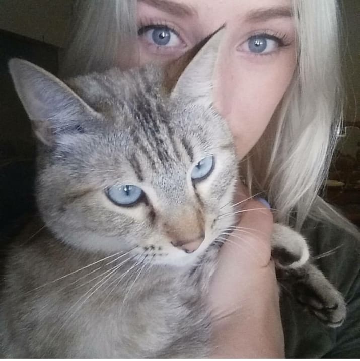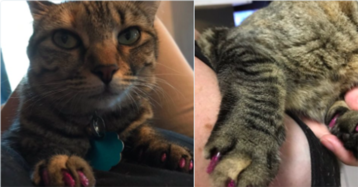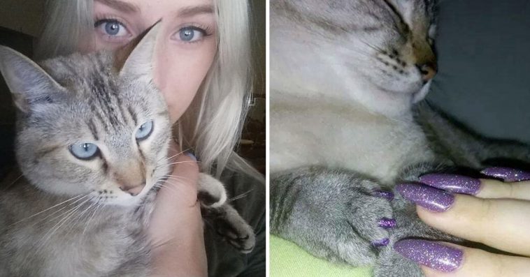 Yes, nail polish is toxic to cats. So, don’t go reaching for your latest bottle of Essie for your feline friend. Instead, Cristi, a cat owner from California, purchased some nail caps for her cat. Then she found a purple glittery set, which matched perfect with her current manicure.