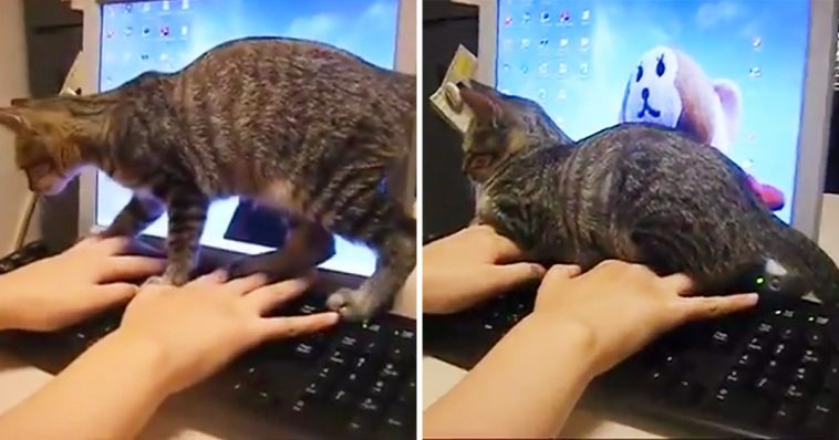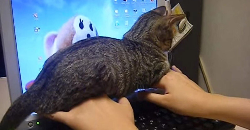 This adorable kitty’s human writes: “When I typed ,the baby tabby cat “Kurumi” jumped on the backs of my hands. She didn’t like that I concentrated not on her but on the computer screen. Even though I tried to take her off my hands, she didn’t move. What a cute cat she is!”