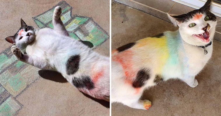 Tali wasn’t happy that her fur was suddenly all different colors, but the family couldn’t stop laughing. The chalk, of course, came off quite easily — but the cats will probably get covered again the next time they go out on the patio.