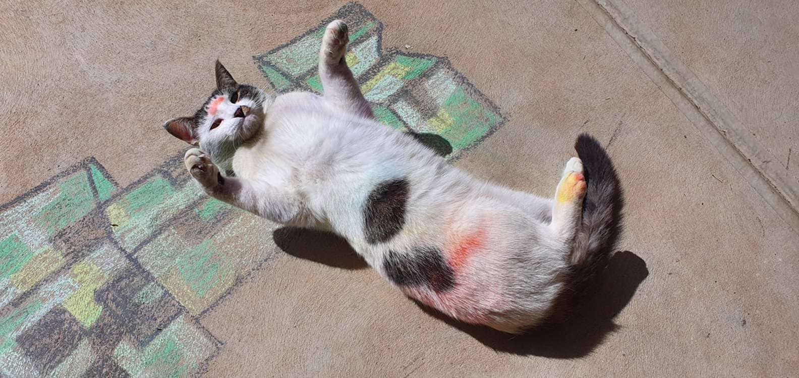 When seeing the chalk drawings, the two cats instantly began rolling all over them, smudging them and covering themselves with bright colors. The family couldn’t stop laughing at their rainbow-colored cats happily rolling and rubbing themselves all over their drawings.