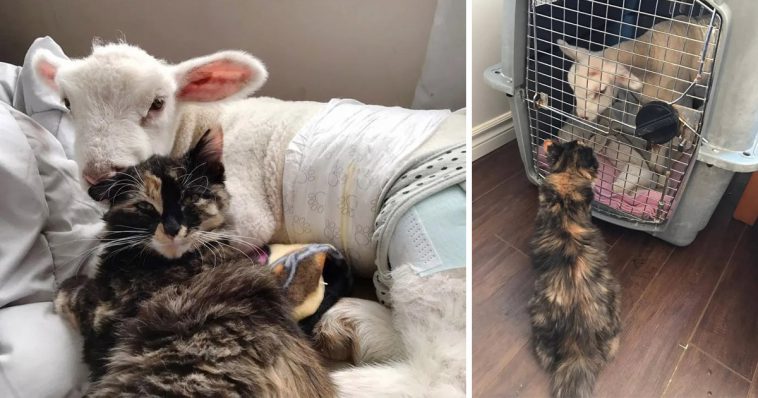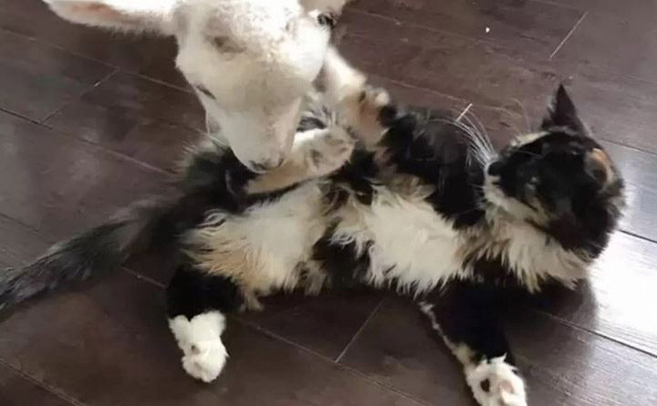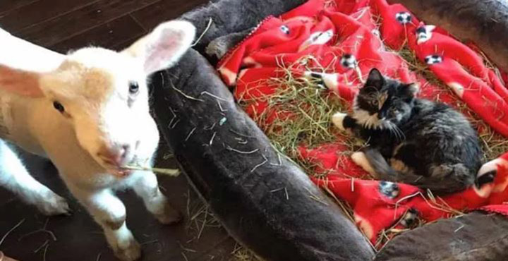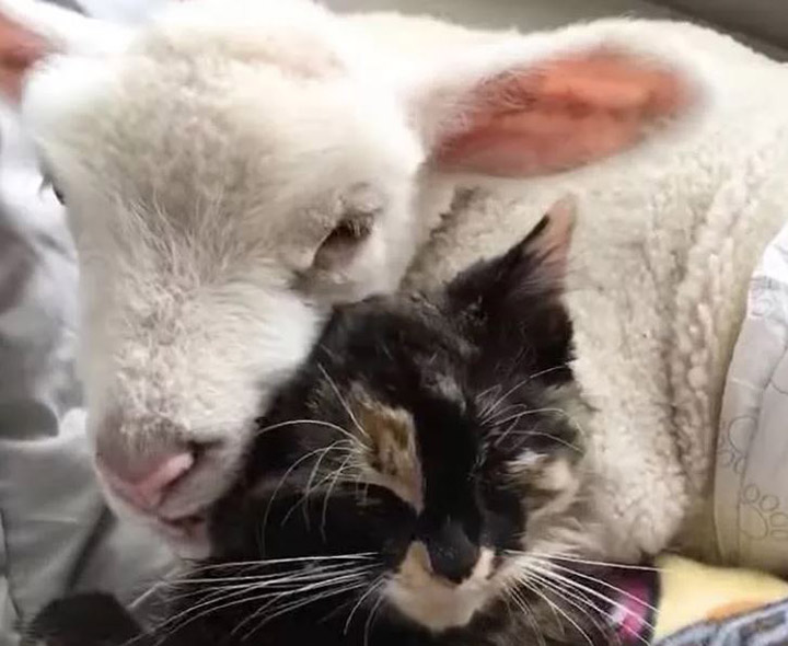 This slightly out of place couple were destined to be friends! Rescue cat Doris has easily taken on the role of nurse but that’s because she is obsessed with her new best friend, who just happens to be a baby lamb.